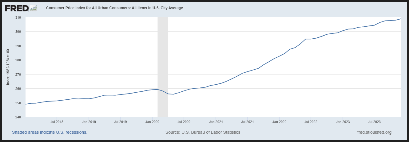 Those figures and the chart above fool most people into thinking inflation is down and under control, but inflation and price levels are two different things. Here is the chart of the actual CPI price level index from 2018-2023, and it is up 24% in five years: