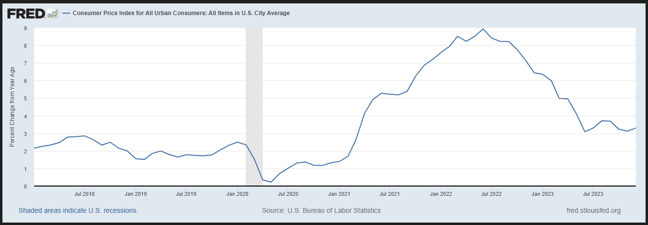 And then there is the possibility of geopolitical crises or wars that would only add to these inflationary pressures. While we have been experiencing disinflation since the inflation rate of change peaked in June of 2022, don’t be mistaken that we still have inflation and that it compounds over time. The government and the financial press like to talk about inflation rates and how they have been coming down, which is true for the year-over-year rate of change, as this chart from 2018-2023 shows: